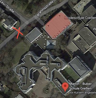 Zur Sporthalle (rot markiert) gelangt ihr über das Hintertor in der Brahmsstraße (rotes Kreuz):